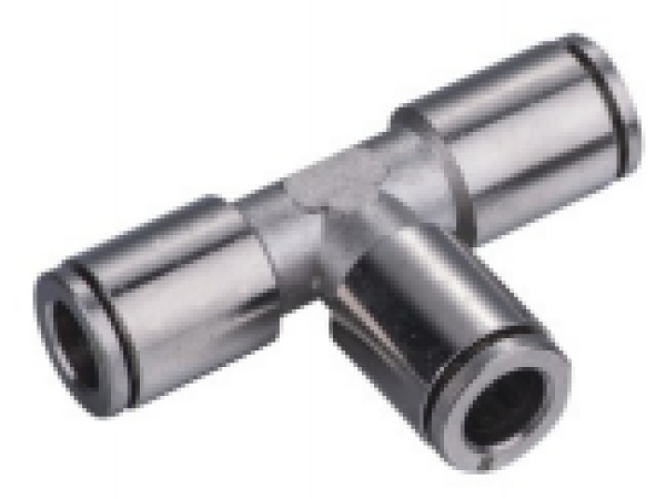 The nickel-plated brass push-in union tee is designed to connect three imperial tubes in pneumatic systems. Featuring a push-to-connect design, it allows quick installation and secure tubing connections without the need for tools.